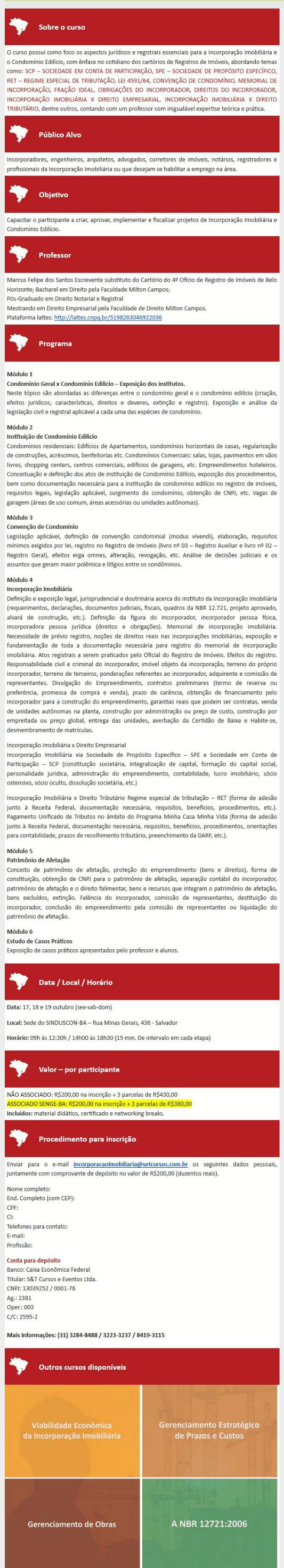 O S & T cursos abriu inscrições para o curso de ”Incorporação Imobiliária e o Condomínio Edilício”, com ênfase no cotidiano dos cartórios de Registros de Imóveis, e as pessoas associadas ao Senge-BA têm 10% de desconto. Aproveite a oportunidade para aprimorar conhecimentos na área!