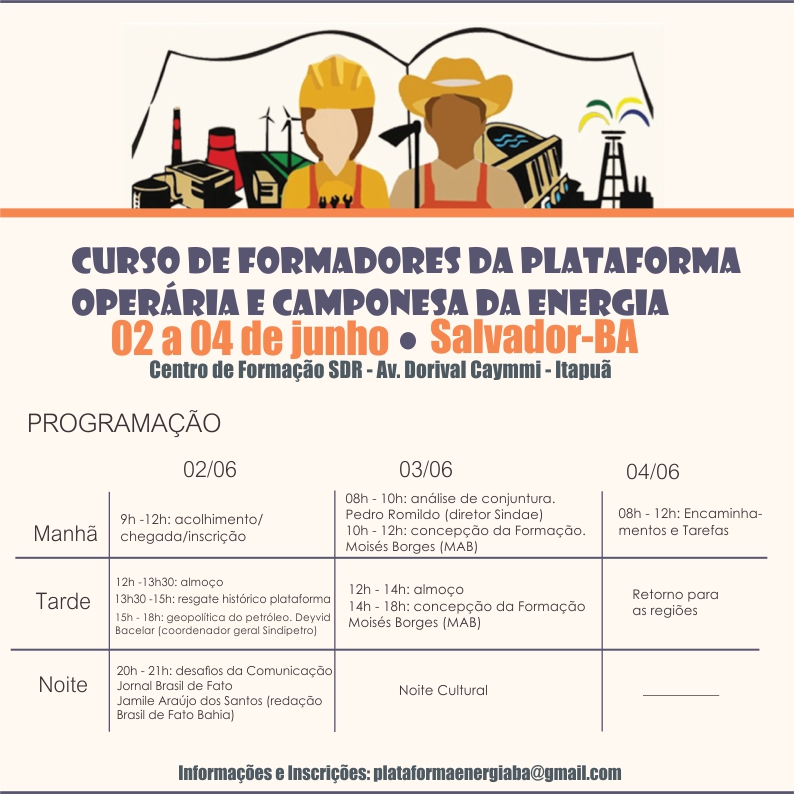 Entre os dias 02 de 04 de junho, no Centro de Formação SDR (Av. Dorival Caymmi – Itapuã) acontece o primeiro encontro do Curso de Formadores da Plataforma Operária e Camponesa da Energia da Bahia. O objetivo principal deste encontro é aprofundar o conhecimento sobre o atual estágio da produção de petróleo e energia no país e sua implicação para as áreas de educação, saúde, emprego e direitos. Ele também servirá para qualificar um grupo estadual de formadores da Plataforma, que deve a partir deste organizar grupos regionais e locais sobre o tema. Este é o primeiro de uma série de encontros que devem se realizar nos próximos dois anos.