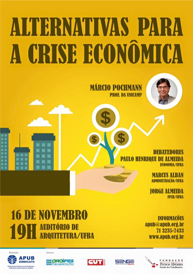 Para manter a mobilização contra os cortes na educação, a Apub Sindicato promoverá, no dia 16 de novembro, às 19h, na Faculdade de Arquitetura da UFBA, o debate “Alternativas para a crise econômica”, essencial para reflexão sobre as possíveis saídas da crise e a garantia do investimento na educação. A atividade conta com o palestrante Márcio Pochmann, professor do Instituto de Economia da Universidade Estadual de Campinas, e como debatedores, os professores da UFBA, Paulo Henrique de Almeida da Faculdade de Economia,Marcus Alban de Administração e Jorge Almeida de FFCH.