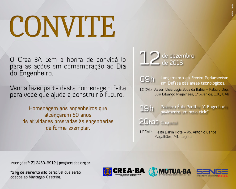 No dia 12 de dezembro, próxima segunda-feira, às 9h na Assembleia Legislativa será o lançamento da Frente Parlamentar em defesa das áreas tecnológicas; às 19h, no Hotel Fiesta, será a palestra “A Engenharia pavimenta um novo ciclo” com o engenheiro eletricista e professor Ênio Padilha.