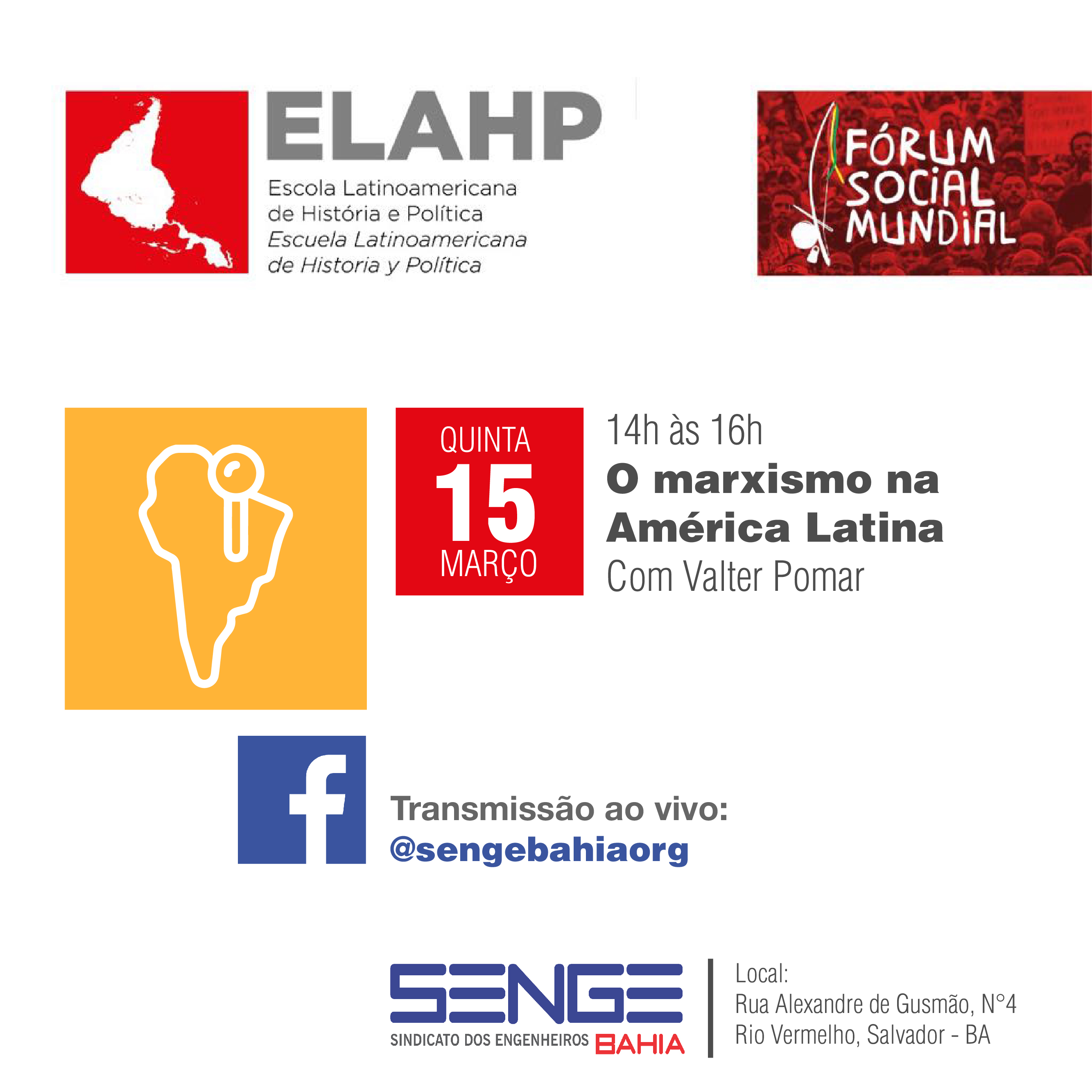 O Marxismo na América Latina O evento acontece das 14h às 16h, será sediado no Senge-BA, em parceria com do Fórum Social Mundial e a Escola Latinoamericana de História e Política (ELAHP).