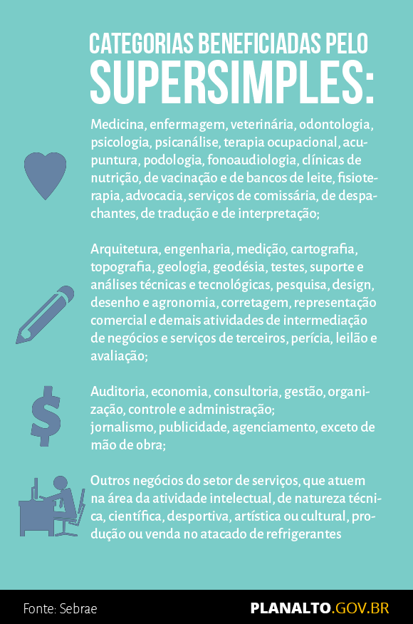 O critério para inclusão no Simples será o faturamento das empresas, em de ser por atividade, podendo chegar a até R$ 3,6 milhões por ano. De acordo com o Governo Federal, a medida beneficiará mais de 450 mil empresas brasileiras.