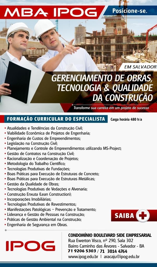 O Instituto de pós-graduação – IPOG está com inscrições abertas para o MBA em gerenciamento de obras, tecnologia e qualidade da construção. As aulas serão em Salvador e estão previstas para dezembro desse ano.