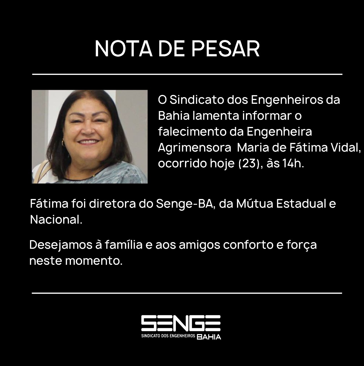 O Sindicato dos Engenheiros da Bahia lamenta informar o falecimento da Engenheira Agrimensora Maria de Fátima Vidal às 14 horas .