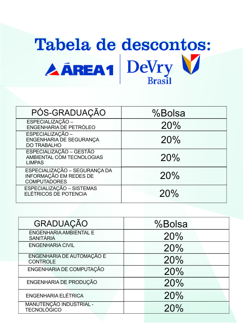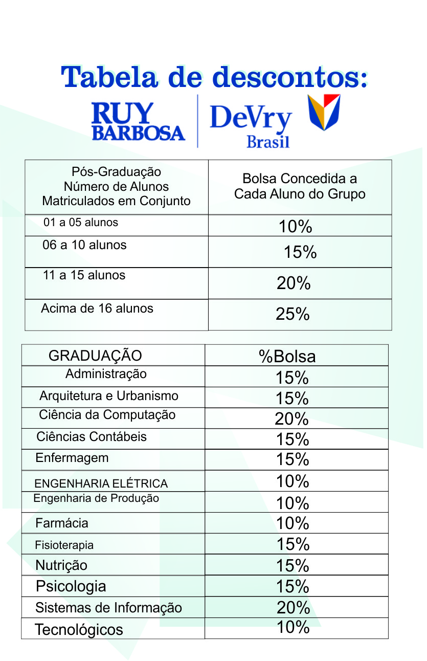 Os descontos vão de 10 até 25% a depender do curso escolhido. Confira a tabela de descontos.