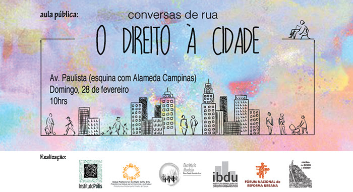 Neste domingo, 28 de fevereiro, a Avenida Paulista será palco da aula pública Conversas de rua: O Direito à Cidade. A ideia é criar um espaço de diálogo, ocupação da cidade e expressão cultural. O evento conta com a participação do Presidente do Senge Bahia, Ubiratan Félix e é realizado pelo Instituto Pólis em parceria com a Plataforma Global pelo Direito à Cidade, o Escritório Modelo da PUC SP “Dom Paulo Evaristo Arns”, o Instituto Brasileiro de Direito Urbanístico (IBDU), o Fórum Nacional pela Reforma Urbana (FNRU) e o Núcleo de Direito à Cidade da Faculdade de Direito da USP.
