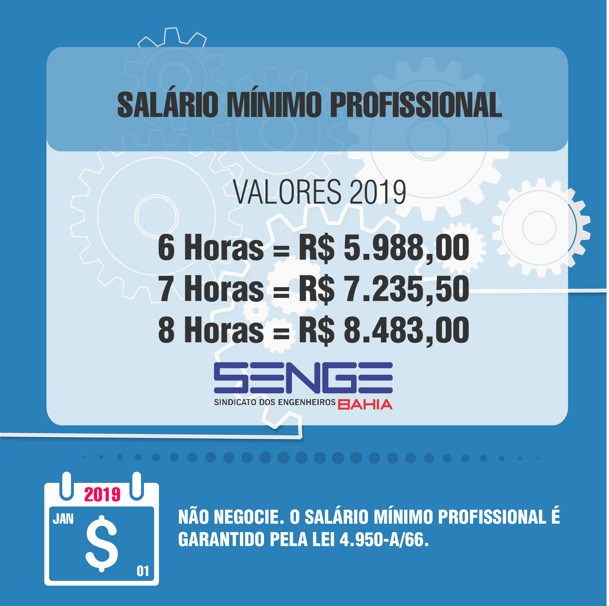 O salário mínimo nacional foi reajustado em 4,61% no dia 1º de janeiro de 2019, passando de R$ 954,00 para R$ 998,00. Com isso, o piso salarial dos profissionais da Engenharia também deve ser reajustado, uma vez que corresponde a 8,5 salários mínimos para uma jornada de 8 horas diárias, conforme a Lei 4950-A/66.