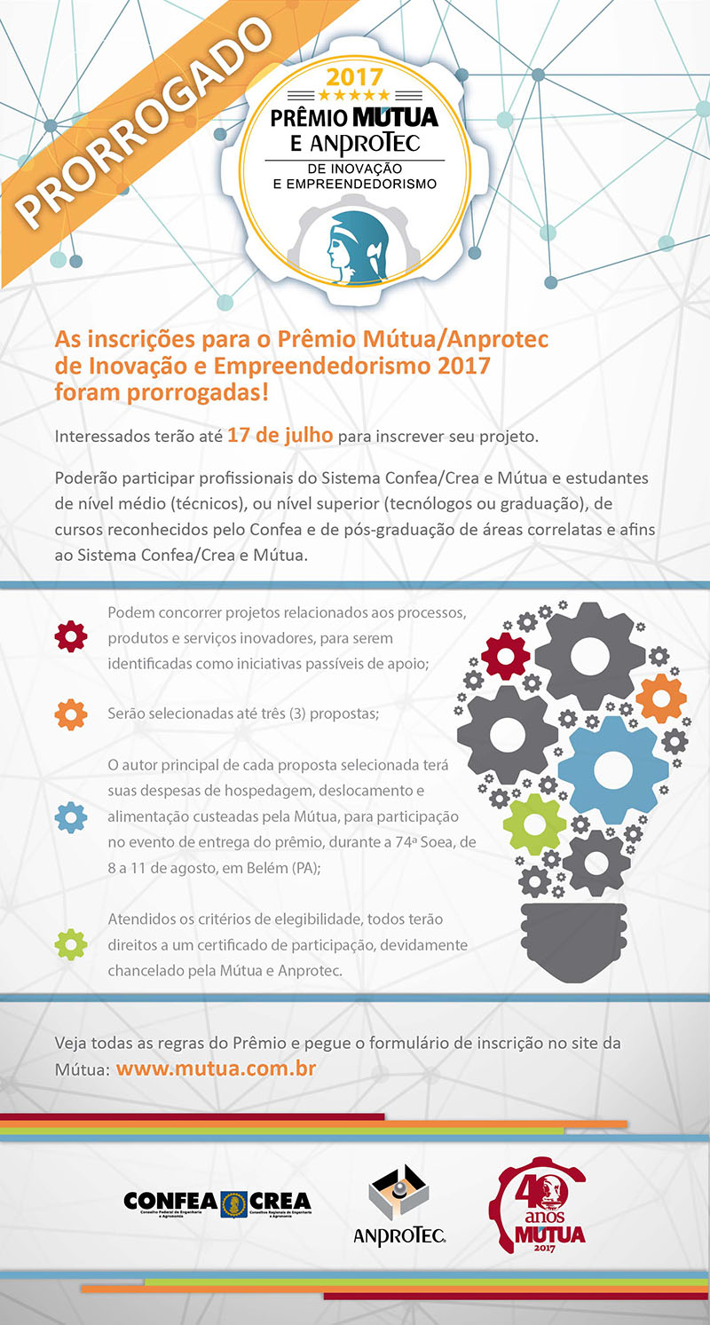 A parceria estabelecida entre a Mútua – Caixa de Assistência dos Profissionais do Crea – e a Anprotec – Associação Nacional de Entidades Promotoras de Empreendimentos Inovadores convida os interessados em participar da seleção para o “Prêmio Mútua/Anprotec de Inovação e Empreendedorismo 2017”, mediante as regras e condições da presente Chamada.