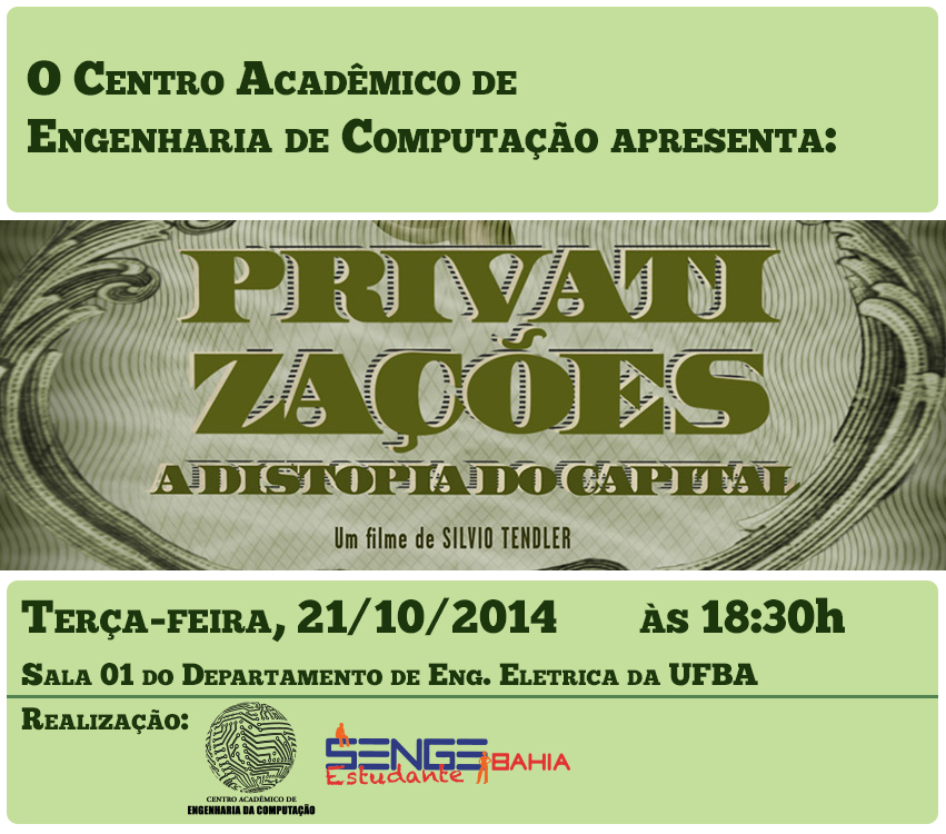 Após a mostra realizada na sede do Senge-BA, o documentário Privatizações: a distopia do capital, de Silvio Tendler, terá nova exibição, dessa vez na UFBA. O filme, que resgata a história das privatizações ocorridas na década de 1990 no Brasil, será exibido nesta terça-feira, 21 de outubro, às 18h30, na sala 01 do DEE na Escola Politécnica da UFBA.