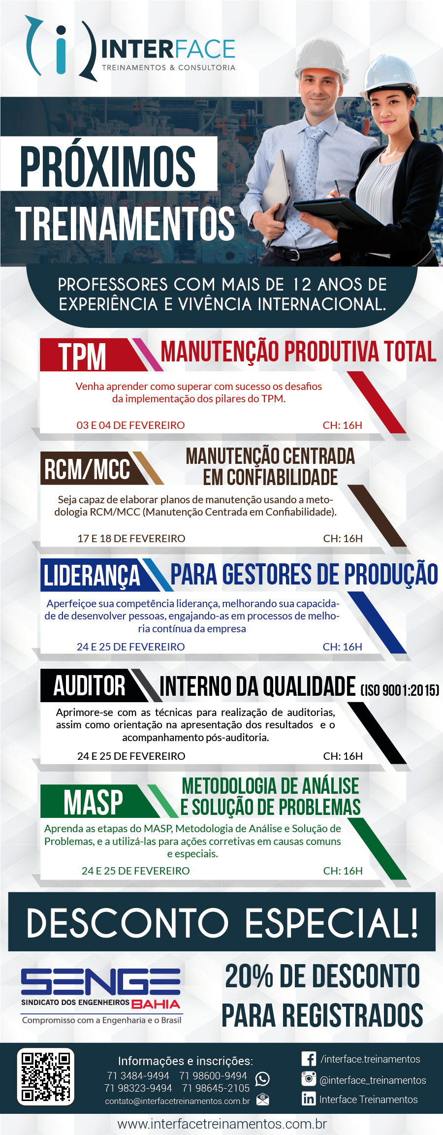 A INTERFACE Treinamentos e Consultoria, realizará novos treinamentos durante o mês de fevereiro e, os associados ao Senge-BA, terão um desconto especial de 20%.