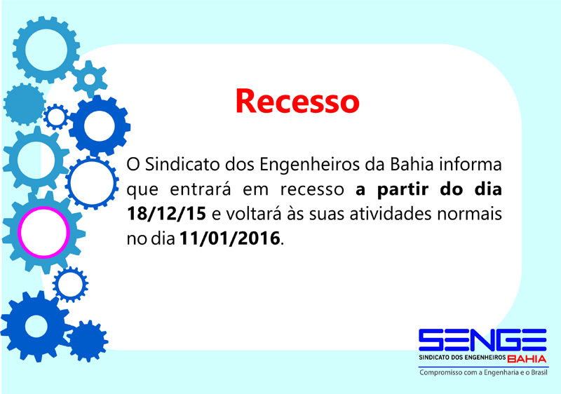 Recesso do Senge Bahia Senge Bahia 18 de dezembro de 2015 Geral 0 Comentários Talvez você goste também 13 de março é dia de luta pela Petrobras e pelo Brasil 11 de março de 2015 Remember, hole penis sleeves are suited to showers and not 24 de março de 2021 IEL promove debate sobre estágio para Engenharia 27 de julho de 2016 Deixe uma resposta Cancelar resposta