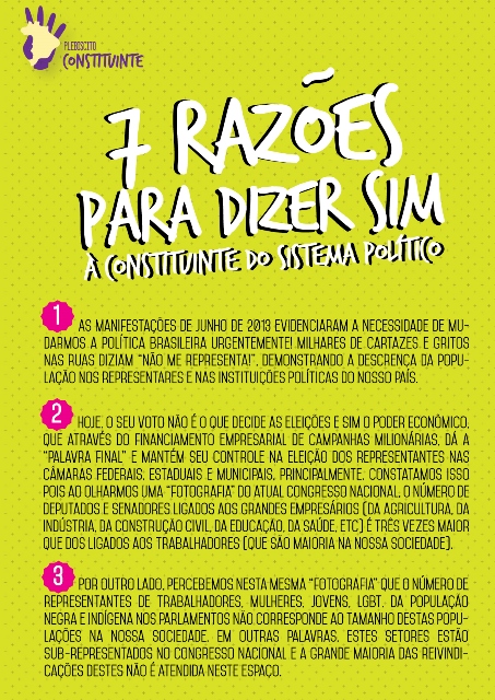 Nós já falamos sobre o Plebiscito Popular por uma Constituinte exclusiva sobre o sistema político. O movimento, que conta com mais de 1.700 comitês, milhares de ativistas em todos os estados do país, e mais de 450 entidades, movimentos e organizações sociais, está realizado votação essa semana, até o dia 07 de setembro.